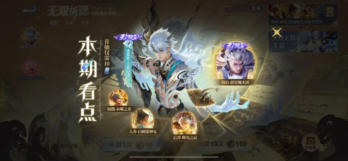 不得不说,这次的无双祈愿活动开启之后,很多玩家都急着入手这两款无双。甚至,山海无双祈愿还出现了界面崩溃的情况,由此可见,这次氪金的玩家是真的多啊。当然了,王者荣耀无双祈愿里面的皮肤保底价格都是多少呢?首先,就是诸葛亮和韩信的无双皮肤,他们的保底已经出炉,是在400-500之间,欧皇一点的话,则是在30抽就能领取了。而杨戬的永曜之星是属于传说限定,保底是在300左右,后羿的辉光之辰和大乔的白鹤梁神女,保底是在200左右哈。在我看来,大乔白鹤梁神女是值得入手的,毕竟堪比传说的建模和海报,深得女玩家的心啊。