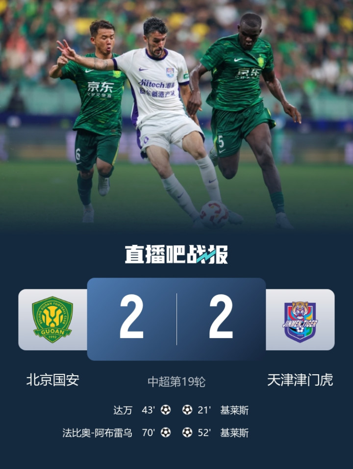 第70分钟,国安再度扳平比分,乃比江传中,法比奥头球破门,国安2-2津门虎。↓