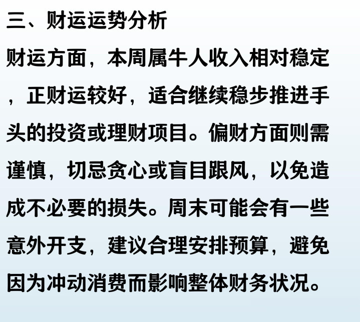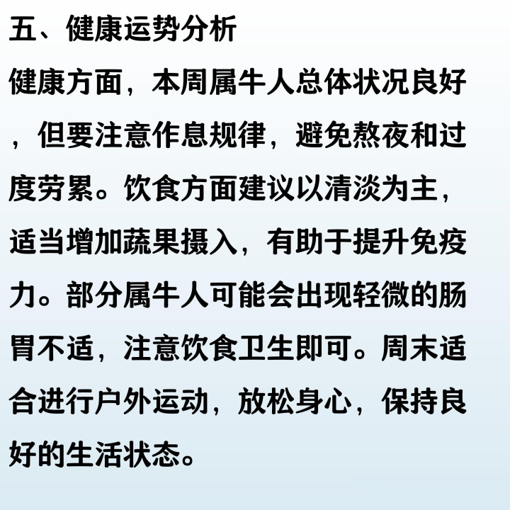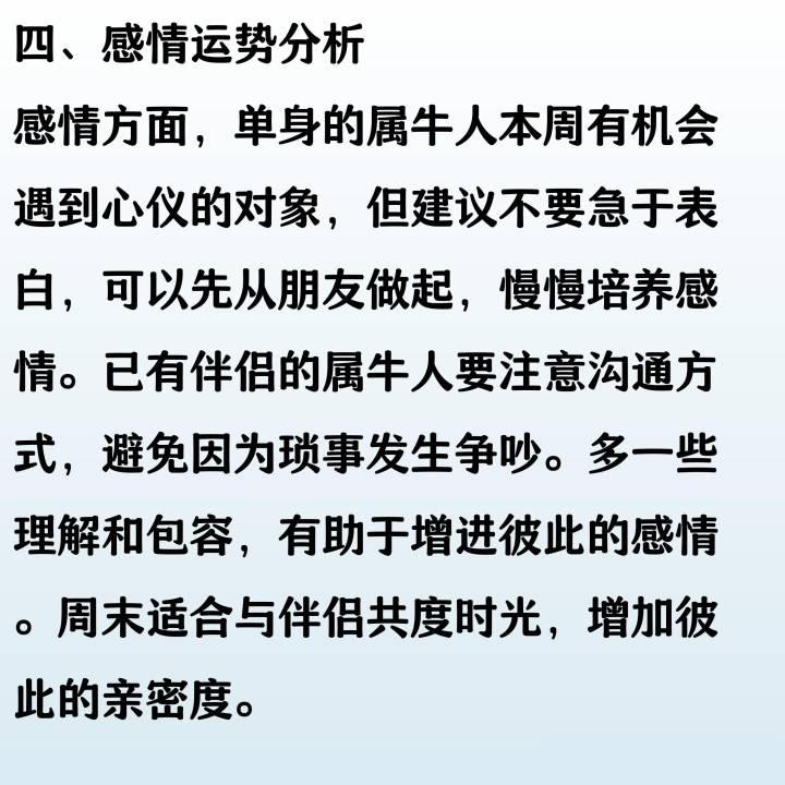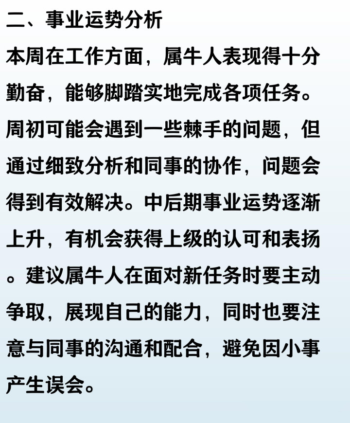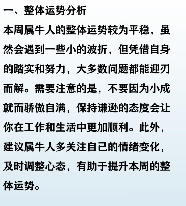 本周属牛人整体运势稳中有进,事业上踏实努力易获上司认可,但需注意与同事沟通,避免因小事产生误会。财运方面正财平稳,切忌冲动投资。感情生活温和,单身者有望遇见心仪对象,已婚者多关心伴侣能增进感情。健康状况良好,但需注意饮食均衡与作息规律。每一天都保持耐心与自信,必能收获属于自己的小幸运。