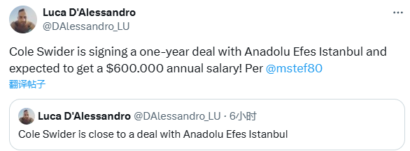 此前名记Stein报道,消息人士透露,科尔-斯威德接近加盟土耳其联赛安纳托利亚艾菲斯队,今日欧洲篮球记者Mihalis Stefanou报道,斯威德将和艾菲斯签约一年,薪水预计为60万美元。