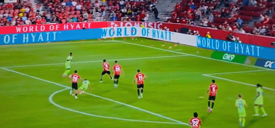 巴萨打出进攻,佩德里将球分给禁区左侧的拉什福德。拉什福德持球,马洛卡后防线严阵以待,安东尼奥-桑切斯、瓦朗特双人夹击拉什福德,萨拉斯在一旁协防。