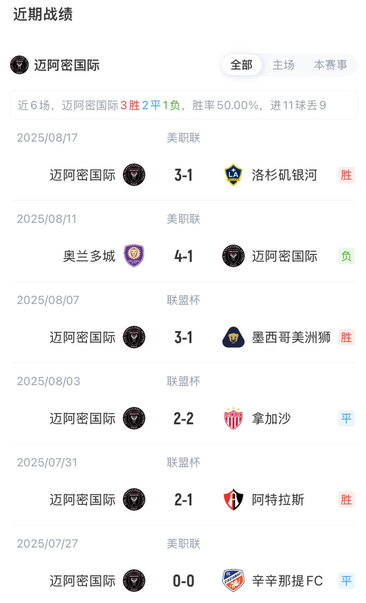 迈阿密国际首发:19-乌斯塔里、17-伊安-弗雷、2-卢扬、37-法尔肯、18-阿尔巴、42-布莱特、5-布斯克茨、21-阿连德、7-德保罗、8-特拉斯科-塞戈维亚、9-苏亚雷斯