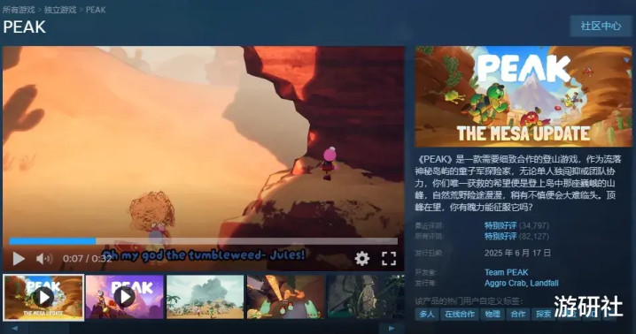 可能有细心的玩家已经在前面的图片里发现了,《PEAK》在Steam界面的开发商并没写着Aggro Crab,而是一个叫做PEAK Team的新工作室。