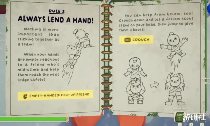但不同的是,它并没把趣味性梭哈在“失败时刻”上,玩家齐心协力下“莫名其妙的成功”,也是《PEAK》成功的一大原因。从上面这张主视觉图,你大概就能看出这款游戏有多强调互帮互助的概念。在刚刚进入游戏的新手教程里,“拉朋友一把”也是一个和攀爬、跳跃等常规动作放在一起的基础操作。