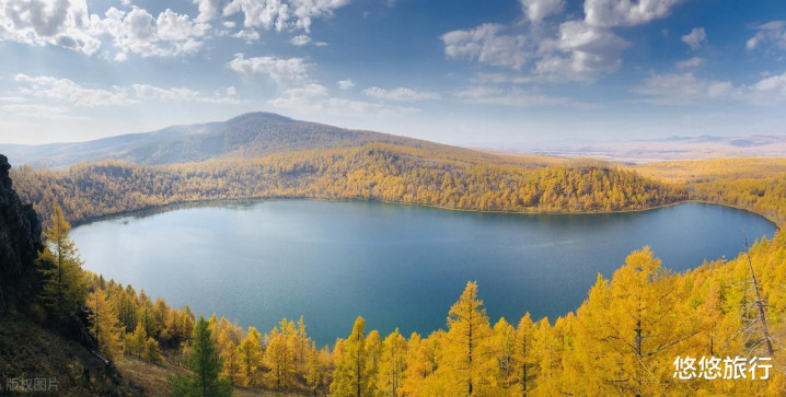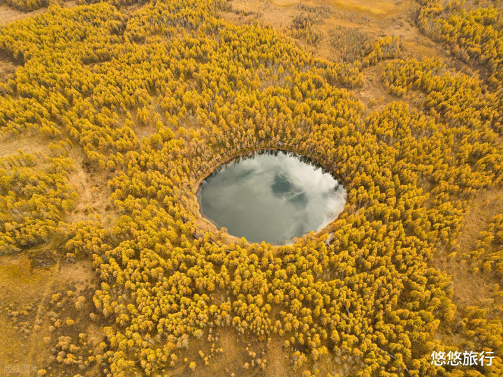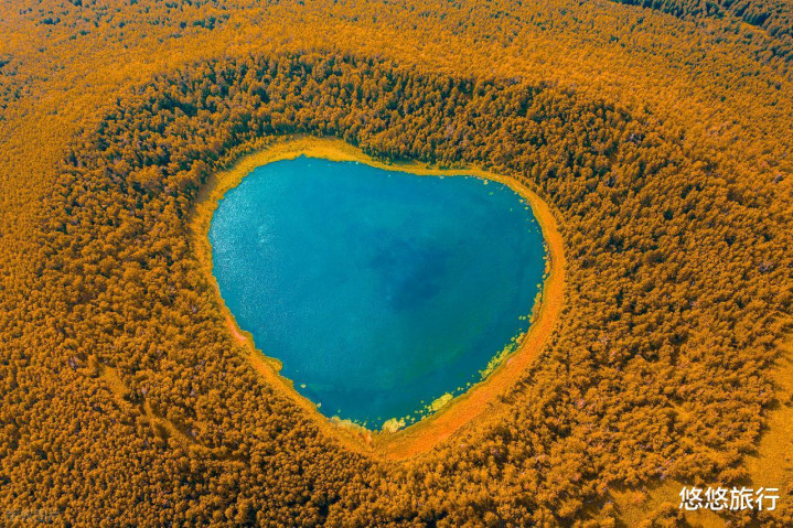 【阿尔山天池】小而精致。拥有一个独立、高大而完整的火山基座,其水面从高空看呈现为一颗蓝色的心形。