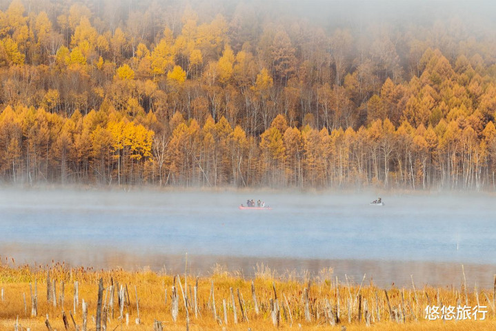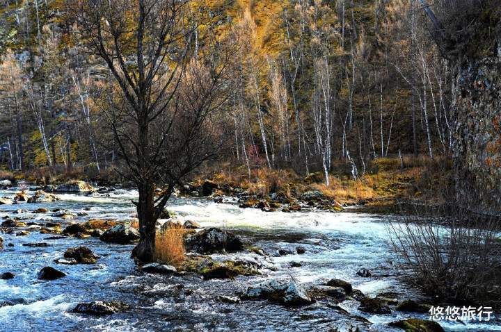 哈拉哈河—不冻河观景平台,可等落日绝美,一路悠闲逛。河水冒着热气,两岸的树木金黄耀眼。