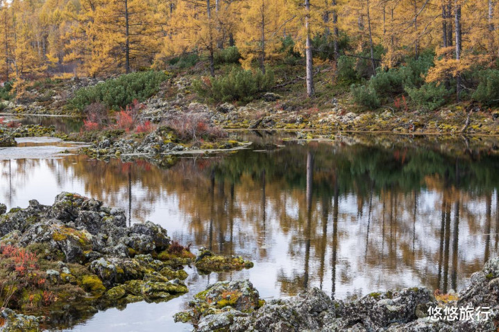 【杜鹃湖】是熔岩流堵塞河谷形成的湖泊,湖面更为平静深蔚,倒影绝美,周遭的金色森林倒映湖中如画。上午时段出现晨雾,仙气飘飘。