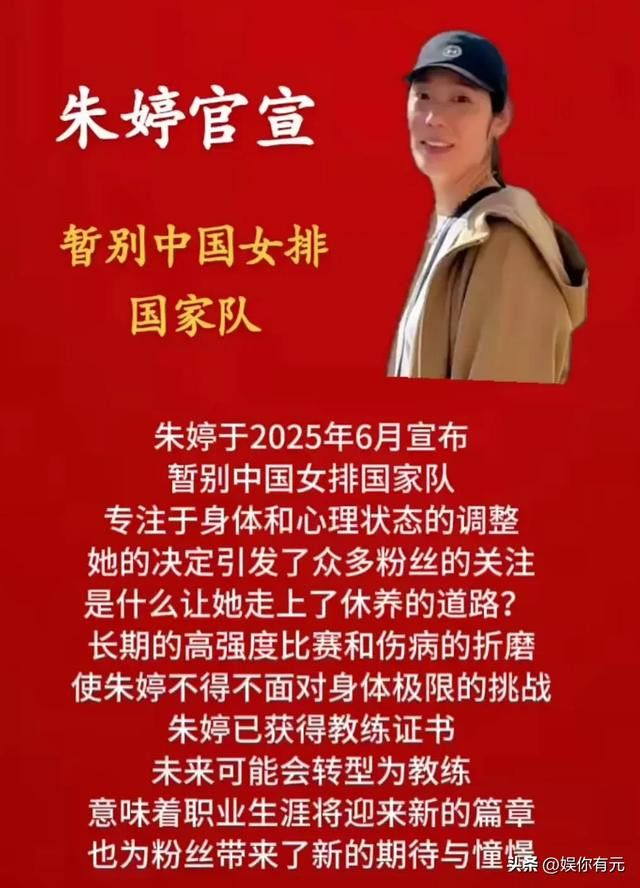 朱婷2025年2月表示要回归河南女排,并要带队参加9月17号在广东的全运会,大家都觉得朱婷要大干一场的时候,她又在6月份突然宣布退出国家队,让大家震惊不已,毕竟朱婷2013年就入选国家队,已经12年了,期间朱婷也为国家队拿了不少荣誉,不过朱婷对外宣布是要调整状态,好好休息,也许没准过阵子又会回来。