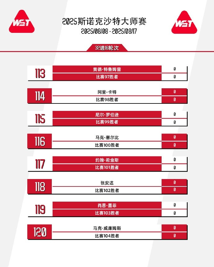 直播吧7月22日讯斯诺克沙特大师赛签表出炉,世界排名前十六的选手将在1/16决赛开始出战,此前比赛为资格赛。