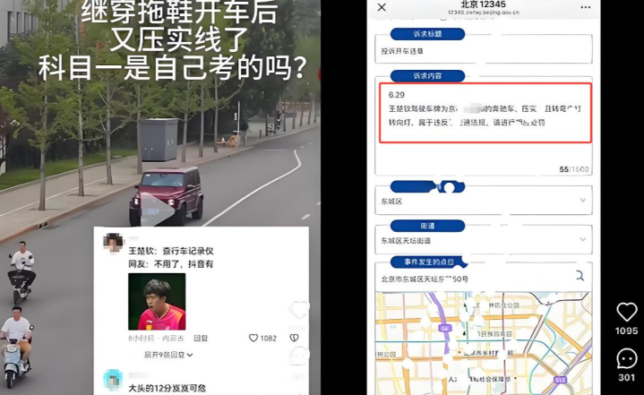 没多长时间,视频就在网络上传播开来,有网友就发现,王楚钦开车回去在转弯的时候,车压越了实线,并且右转向灯也未开启。