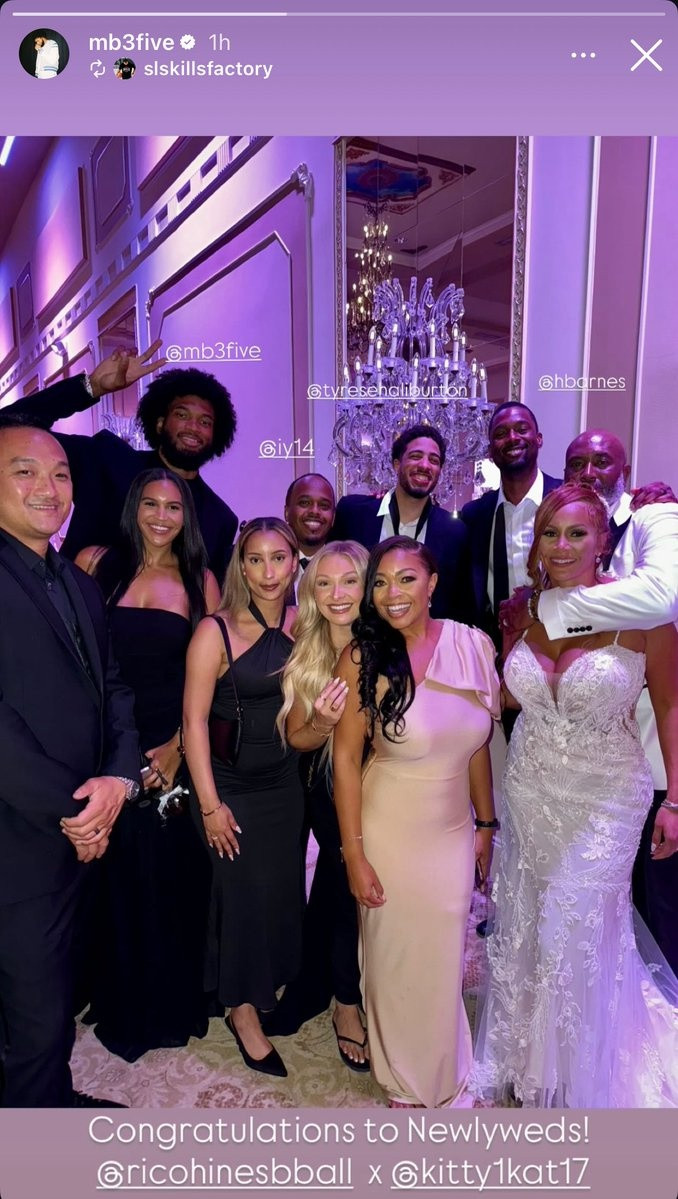 直播吧8月4日讯据国王记者ChrisWatkins报道,泰瑞斯-哈利伯顿、马文-巴格利和哈里森-巴恩斯近日一同参加了76人助教里科-海因斯的婚礼。