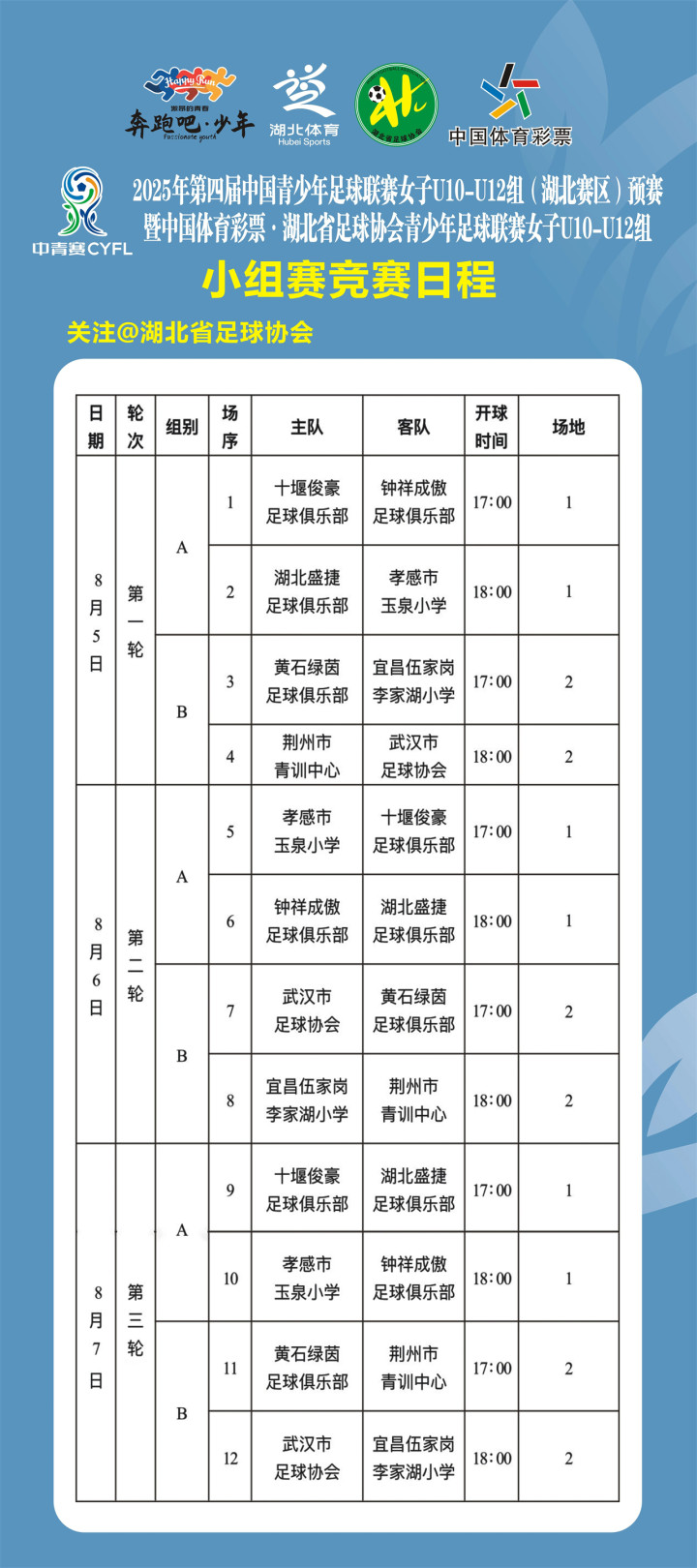 本次联赛由湖北省体育局足球运动管理中心、湖北省足球协会主办,宜昌市体育局承办,宜昌市体育运动学校协办,比赛将于8月5日至8月10日在宜昌市体育运动学校举行,共有来自全省各市州 8 支代表队 168 名教练员、运动员参赛。赛事期间将继续开展“霜计划”足球公益活动,评选出“霜之师”和“霜之星”各一名。