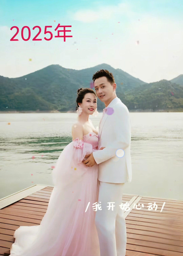 还有一张拍摄于今年,两人立于波光粼粼的湖泊前,他穿着一身白色的西装,她盘起了头发,身穿抹胸礼服,画面很唯美,真是幸福的人儿啊。