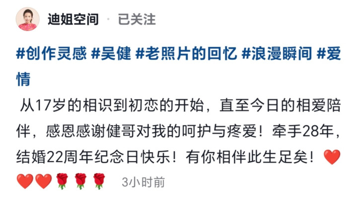 今天(8月6日),他在社交账号发文表白妻子:“浮华万千,不如一隅心安;灯火繁繁,不如归处一盏。牵手28年,结婚22年周年纪念日。幸福,继续”,并配上了3个撒花的表情包。此外,他不忘艾特了妻子。