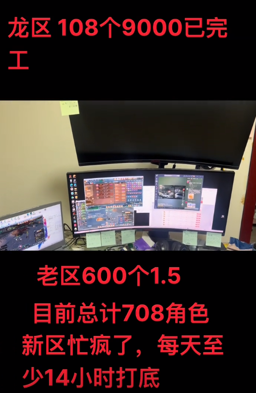 这哥们自曝在龙虎服新区创建了108个角色,在黄金服老区还有600个角色,合起来一共有708个角色,每天都忙疯了,至少要工作14个小时!