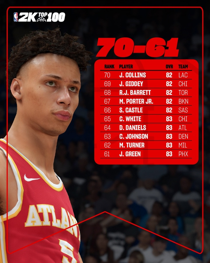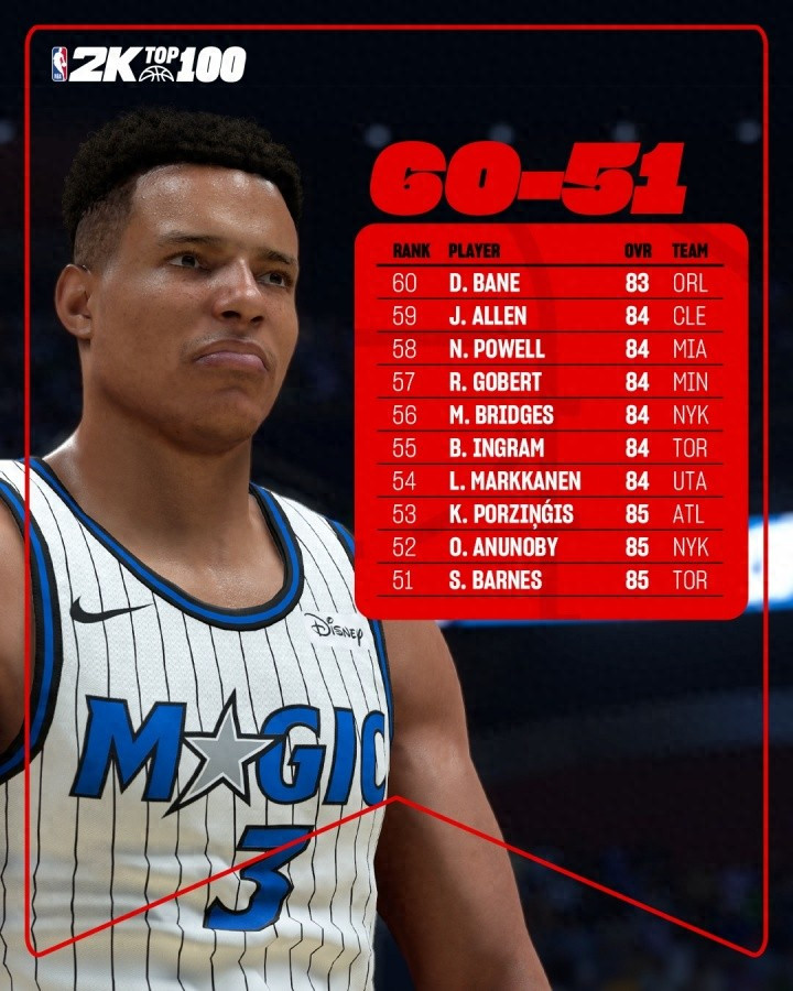 直播吧08月18日讯 NBA 2K官方公布了2K26初始能力值前71-100的名单,今日更新70-51的排名: