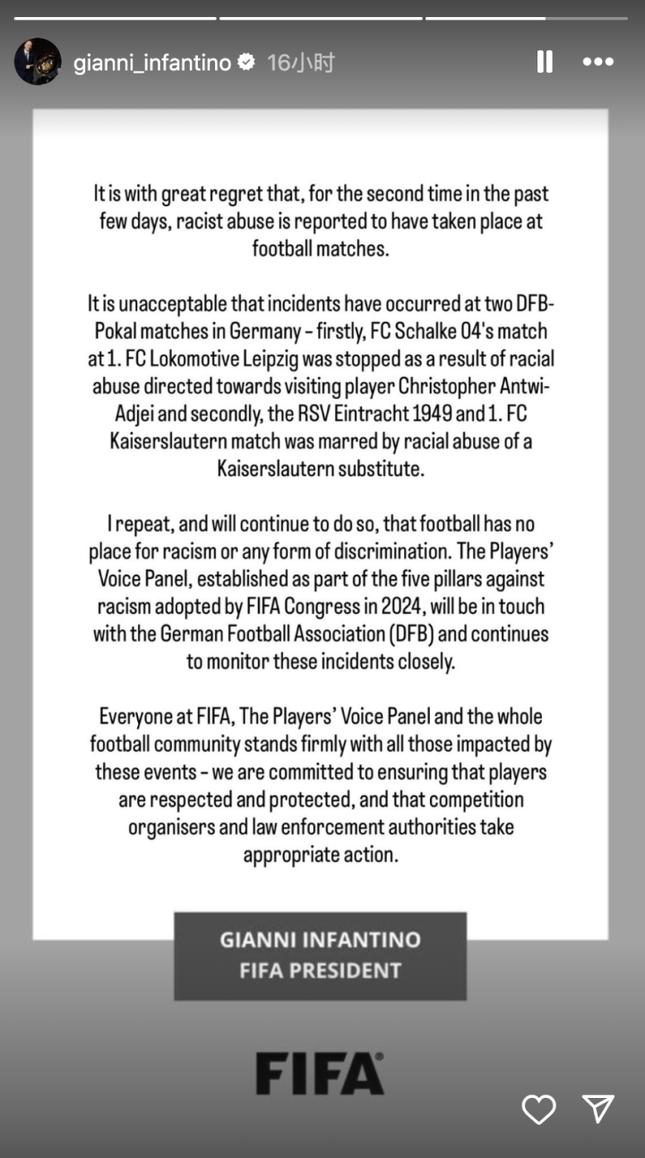 因凡蒂诺在社交媒体上写道:“在德国杯两场比赛中发生的事件是不可接受的。足球不容种族主义或任何形式的歧视。”他还表示,FIFA的“球员之声”小组将与德国足协保持联系,并强调将与受害球员站在一起,敦促赛事组织者和执法部门采取适当行动。