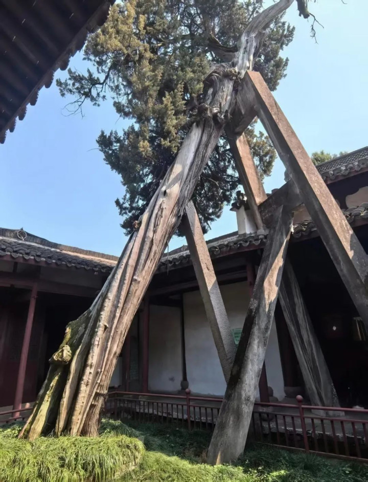 据说说是五代十国那位吴越王钱镠亲手栽的,如今老树歪着身子斜着长,如今用架子撑着,像是配了副拐。