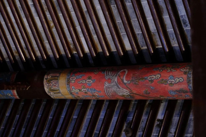 正殿步桁处还残留着最后两幅“凤穿牡丹”,除此之外, 那些飞腾的团龙和朝阳的丹凤都被石灰涂刷了。