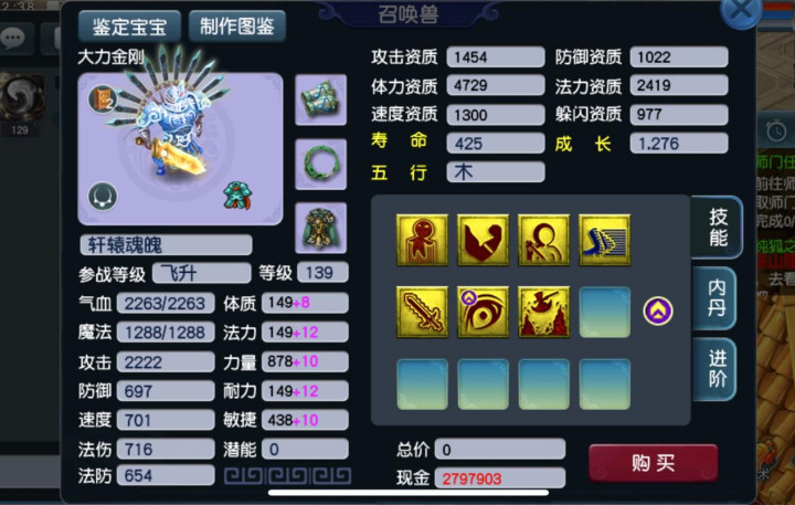 上面的这只大力金刚就有一个小敏捷,上面的这位玩家想要将这个小敏捷给打掉,小编给出的建议是不要再改书了,给已经成品,而且进阶110的召唤兽改书失败的后果是比较严重的,低级敏捷也能够增加速度,只不过增加的稍微少点罢了。如果真的认为速度比较慢,那就换套装,直接带高级敏捷的套装。宁肯少技能,也不要给成品召唤兽改书。