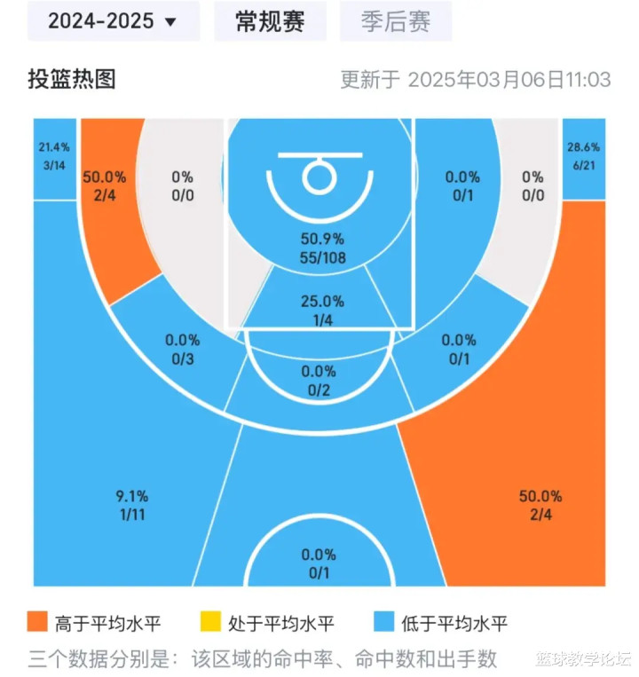 从大学到NBA,三年的时间,普罗斯珀的投射一直没练出来。本来有成为3D锋线的潜质,可惜进攻技术粗糙。上赛季独行侠伤兵满营,普罗斯珀得到重用,但没能抓住机会。常规赛后半段,自己因伤报销!来看看他上赛季投篮热图: