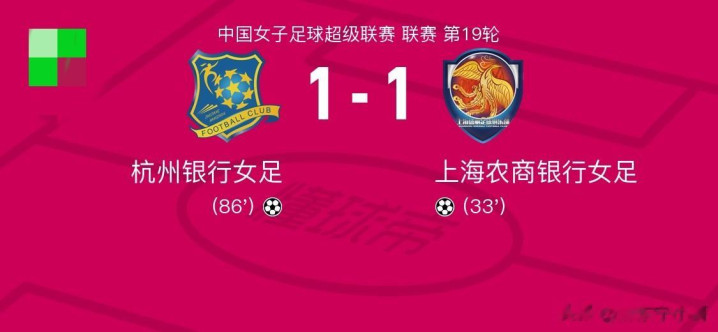 杭州银行女足1-1上海农商银行女足。第33分钟,上海农商银行女足球员打入一球,下半场第86分钟,杭州银行女足球员打入一球,最终比分杭州银行女足 1-1 上海农商银行女足,握手言和、各取一分。