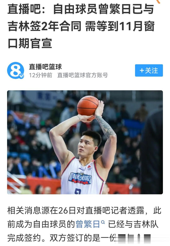 3、吉林男篮休赛期姜宇星离队,但引进了多名可轮换球员,如刘雁宇、赵帅州等。而根据直播吧的消息,曾凡日也将在11月份的窗口期加盟。