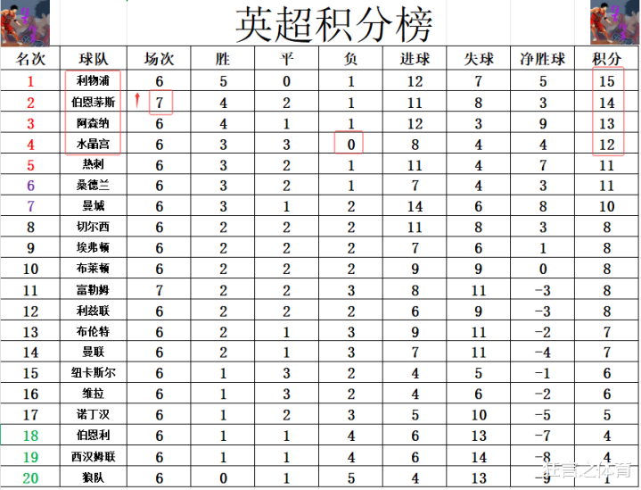 积分榜方面,利物浦上轮5连胜被终止,不过他们仍然是位列榜首,领先阿森纳2分。伯恩茅斯今天逆转绝杀富勒姆后,近6轮4胜2平保持不败,先赛的情况下超过阿森纳1分升至第2。输球的富勒姆还是多曼联1分,排在第11。