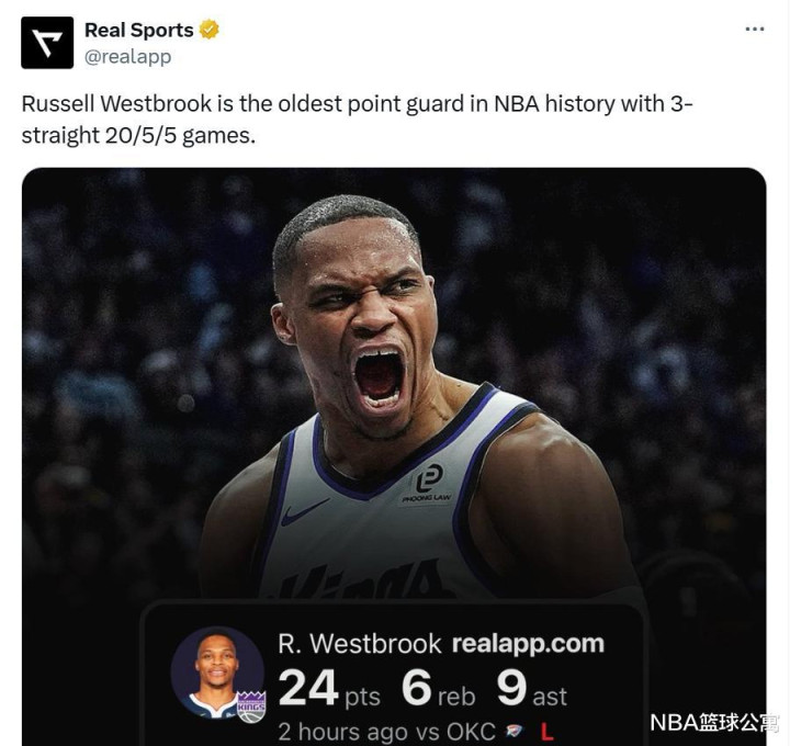 此役,威少还创下了纪录。数据显示,威少已经连续三场砍下至少20分5板5助攻,为做到这点历史最老后卫(36岁361天)。