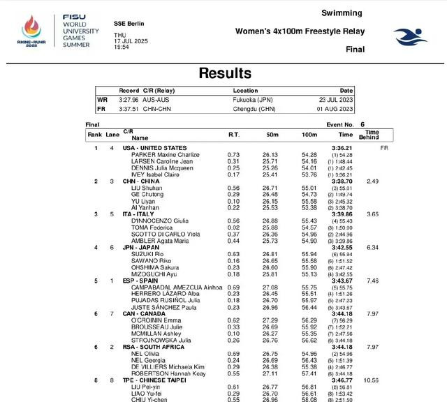 在男子4*100米接力比赛中,南非仰泳名将科特斯首棒47秒88,大幅提升个人最好成绩,幅度达到0.75秒之多,47秒俱乐部再添一人。美国的马特金开棒也有48秒。世界大学生运动会男子百自都如此卷,让我们更加期待新加坡的争夺了。