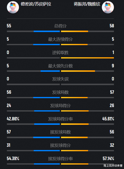 比赛重新开打之后,经验丰富的德差波开始主动上前,为苏皮萨拉分担防守压力,但并没有太明显的效果,蒋振邦/魏雅欣一直牢牢掌控着局面,并且在14-9领先时连得3分扩大优势,尽管对手顽强在局末将比分追至19-20,但兴邦组合拿下了制胜分,以21-11取得了开门红。