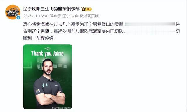 而相比威尔斯,截至目前与上赛季相比辽宁男篮已经确定5人离队。第一位是体能训练师。此前俱乐部已经官宣体能教练海梅离队,因个人规划调整,海梅重返欧洲并加盟欧冠冠军费内巴切队。海梅在2020-2021赛季加盟辽篮效力球队4个赛季。