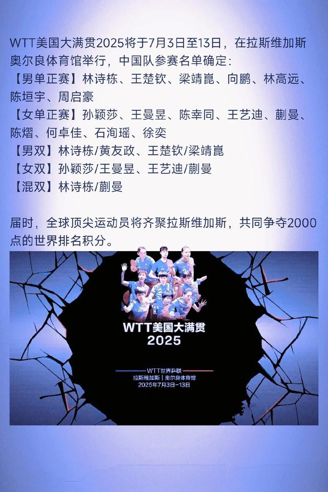 WTT美国大满贯赛事7月3日下午部分低积分运动员从资格赛打起,国乒大部分运动员是5号才有比赛,到13日结束,比赛为期10天,在两个场地举办比赛,一个是拉斯维加斯奥尔良体育馆,另外一个是美高梅大酒店会议中心盛大举行。