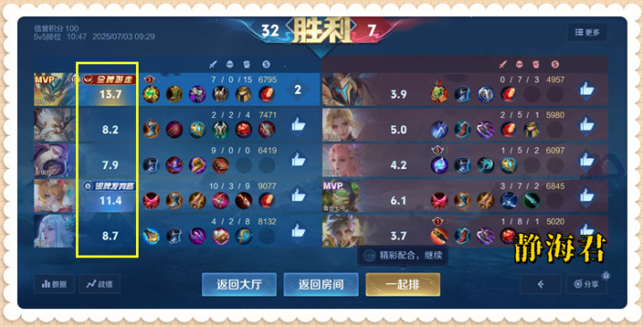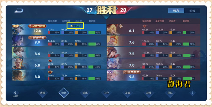 我真的没开玩笑,以养猪流为例:四个辅助可以确保后羿每一局都拿超高评分,结算评分是16分的话,后羿铁定是彩牌,即使输了也能加1颗星,又因为结算评分16分,后羿每一场的表现分肯定也很高。