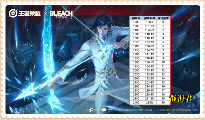 巅峰2400分→265%巅峰系数,对英雄的胜场要求为20。