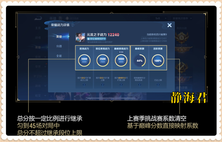 现在是将胜场战力+排位表现战力+巅峰表现战力之和,按照一定的比例进行继承,并匀到45场对局中。至于巅峰系数,则按照巅峰赛开赛后的巅峰分直接映射系数。