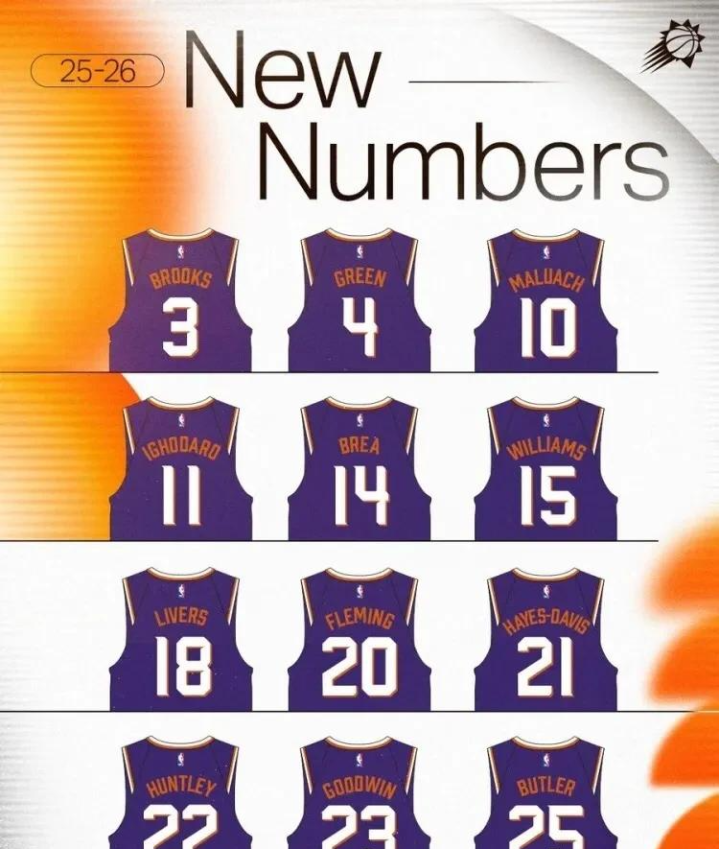 太阳官方账号更新信息,晒出球队部分球员新赛季球衣号码。
