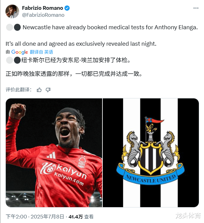 北京时间2025年7月8日14点00分,据知名转会记者罗马诺的消息,纽卡斯尔已经正在安排埃兰加进行体检。这名来自诺丁汉森林的边锋上赛季代表诺丁汉森林出场43次打入6球助攻12次。