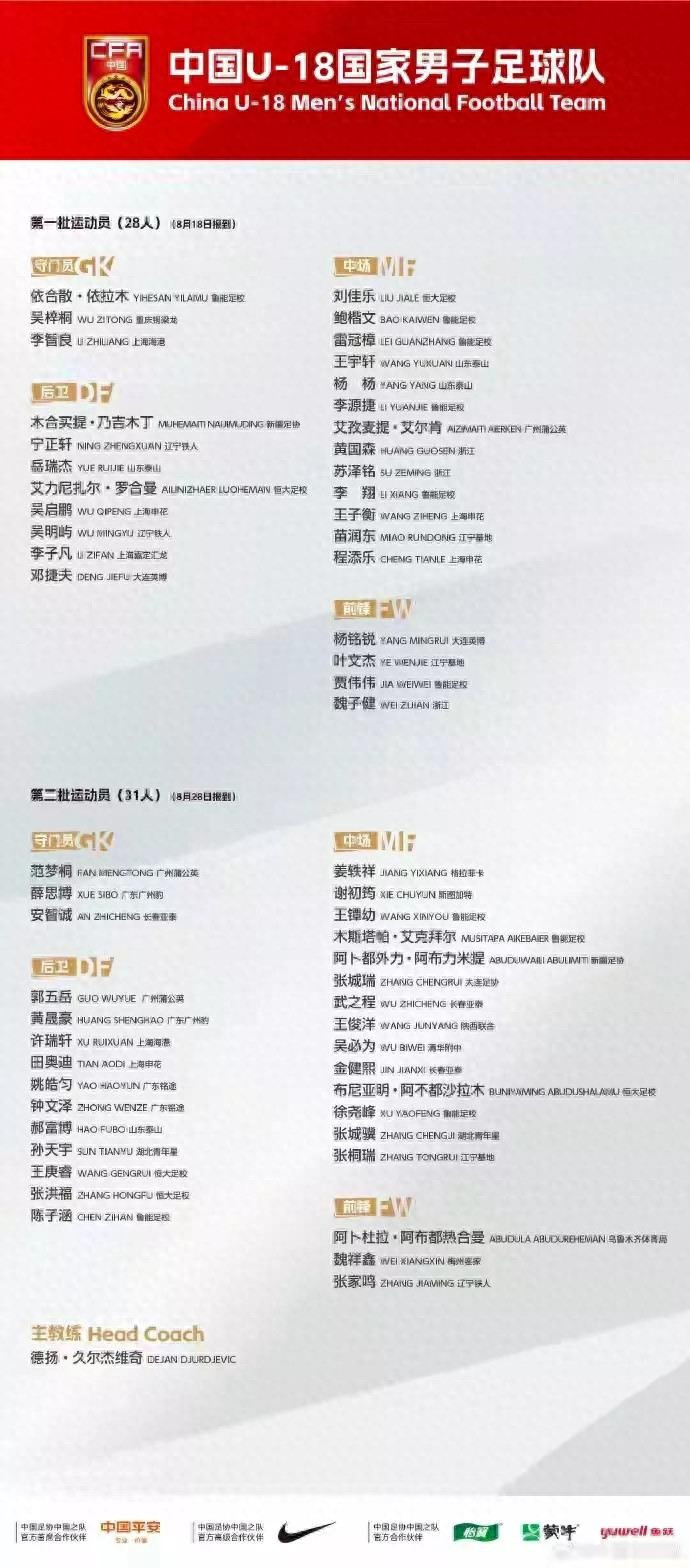 不用多说,球队肯定0708这年龄段球员。59人,大概两支半球队,久尔杰维奇会在这些人中挑出20多个参加中日韩三国运动会的阵容。这是短期比赛任务,未来备战U20亚洲杯,球员会有出入,不会大批次更换。恐怕也没几个人是这59名单之外。