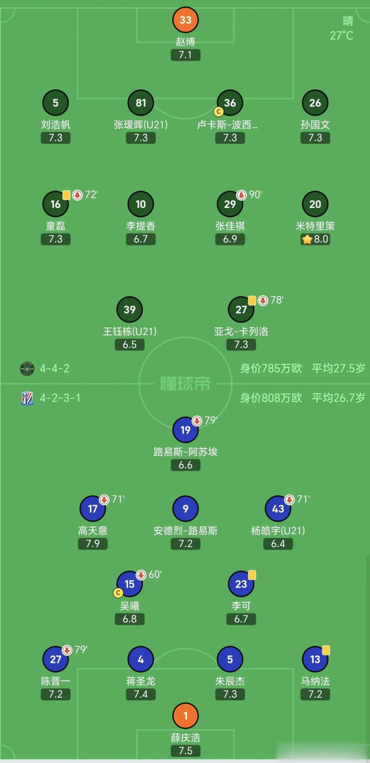 本场比赛结束之后,双方动态评分也随之出炉,其中浙江队外援米特里策最佳,上海申花门将薛庆浩获评7.5分。