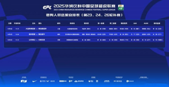 另外两场比赛,大连英博vs青岛西海岸的主裁是马运坤,而山东泰山vs云南玉昆的主裁则是张超,两场的VAR视频裁判分别为刘钊和刘威。